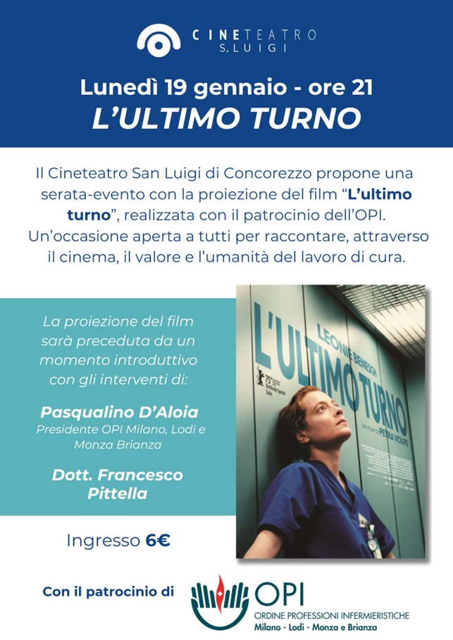 Il Cineteatro San Luigi di Concorezzo propone una serata-evento con la proiezione del film L’ultimo turno, in programma il 19 gennaio alle ore 21.00, realizzata con il patrocinio dell’OPI di Milano Lodi Monza e Brianza, che presenzierà alla proiezione.